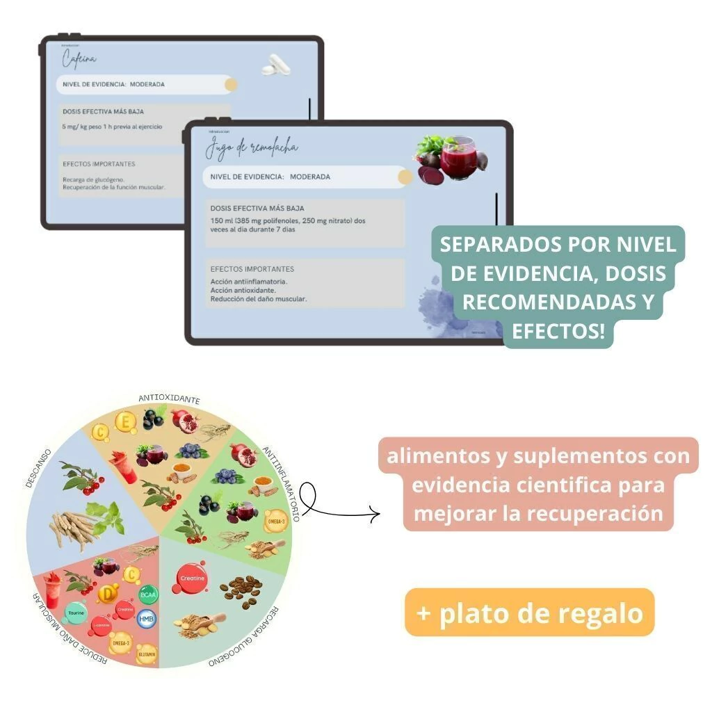 ✅ Resumen de la evidencia científica de cada nutriente y suplemento (vitamina C, E, granada, arándano, grosella negra, curcumina, jugo de remolacha, jugo de sandía, BCAA, HMB, creatina, glutamina y más).