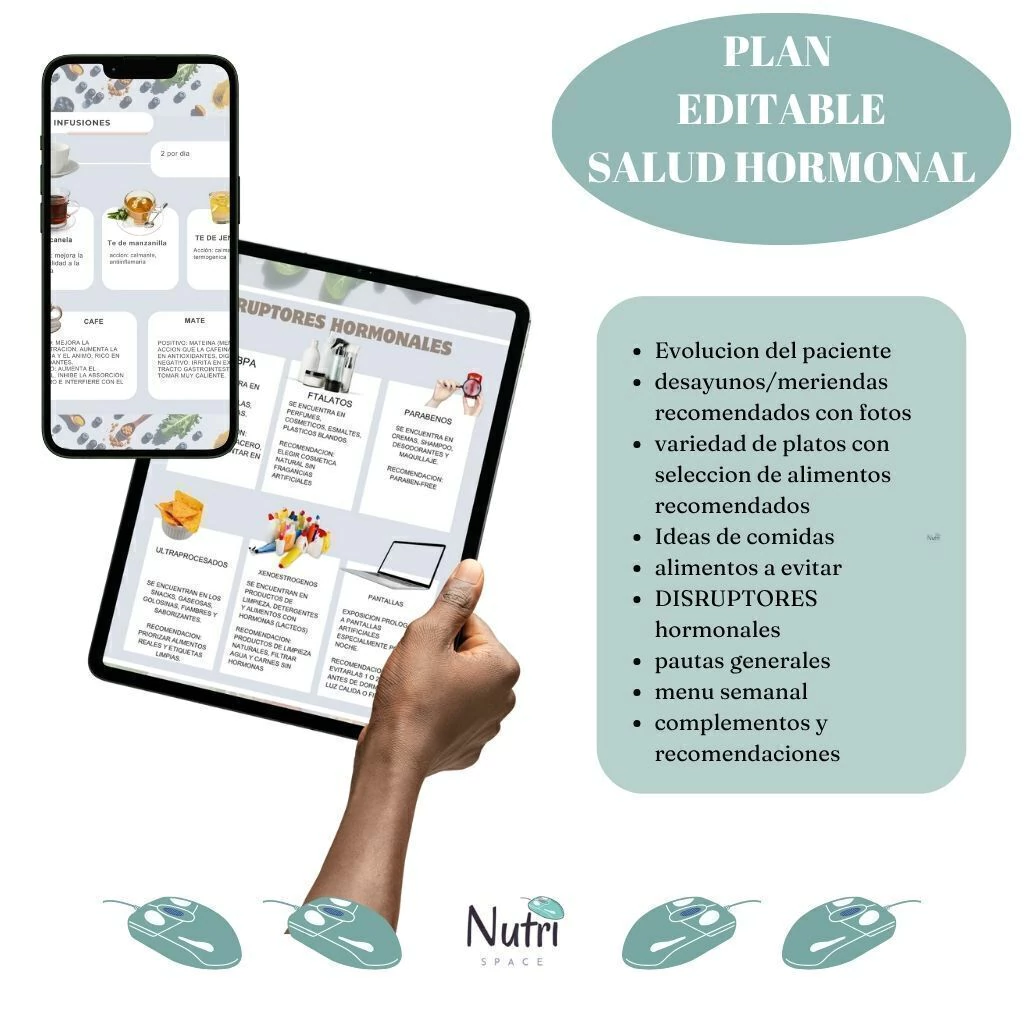 Este Plan de Alimentación Editable especial para EQUILIBRAR LA SALUD HORMONAL FEMENINA está pensado especialmente para pacientes que estan ante un desequilibrio hormonal como SOP, problemas de fertilidad, tiroides, salud metabolica, acné, entre otros. Este plan te ayudara a individualizar la alimentación de tu paciente de forma completa y equilibrada segun los nutrientes que se tornan criticos y contemplando los principales DISRUPTORES HORMONALES