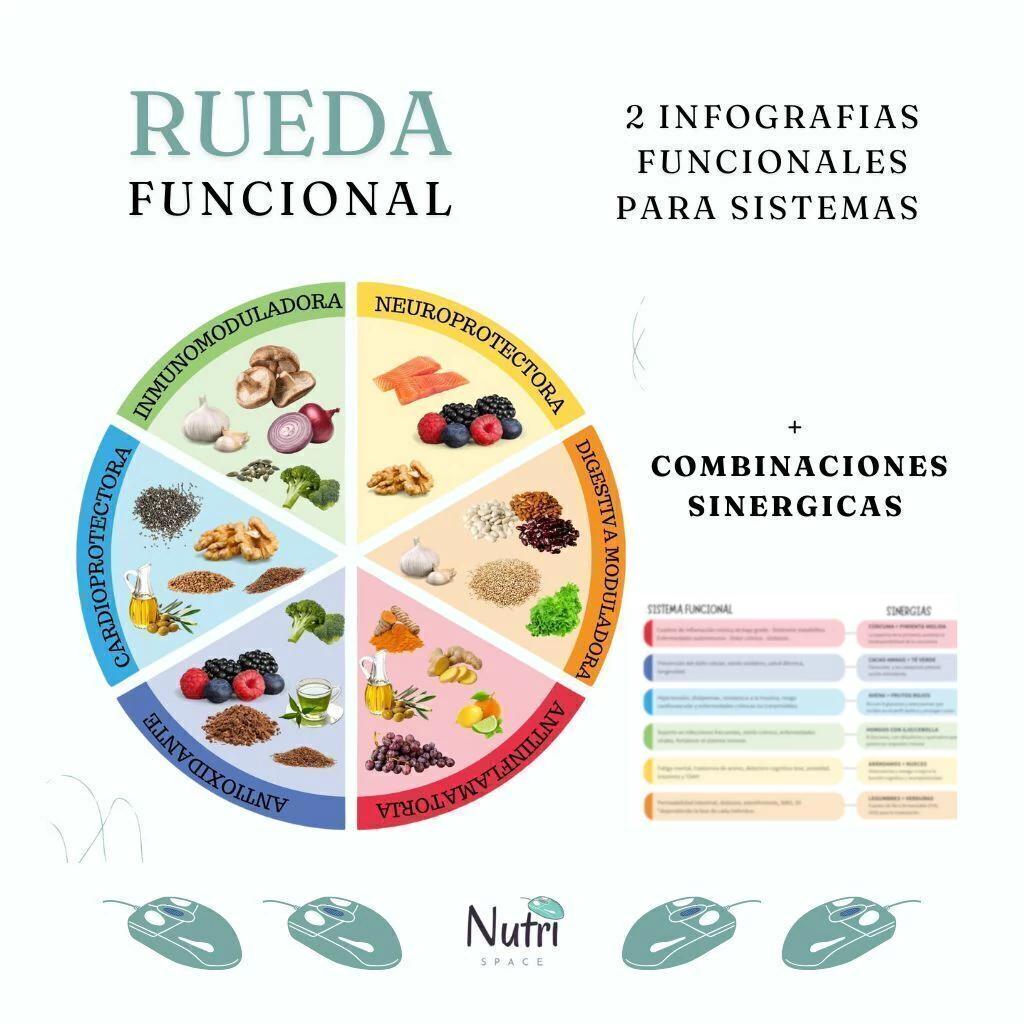 Estas dos infografías reúnen de forma clara y visual 6 sistemas funcionales (inmunomodulador, cardioprotector, antioxidante, modulador intestinal, neuroprotector, antiinflamatorio) con su correspondiente recomendación en alimentos funcionales.